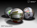 In einem gewölbten Projektionsraum demonstriert Stefan Lehmann, wie 360°-Panoramen im Raum erfahrbar werden und welche Interaktionsmöglichkeiten sich für den Betrachter bieten. Die Anwendungen seiner Rauminstallation '360°interaktiv' sind zugleich für den Einsatz im Internet und auf CD-ROM konzipiert.